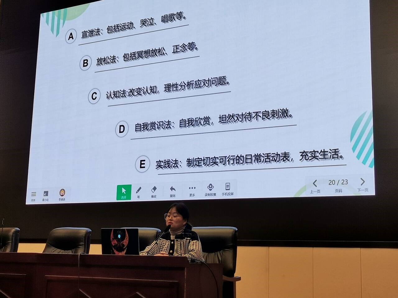 首先,李淑進針對目前中職學生容易出現(xiàn)的心理問題,結(jié)合實際案例,分別從什么是抑郁癥、抑郁癥的典型癥狀、抑郁癥與抑郁情緒的區(qū)別、怎樣識別抑郁癥、如何幫助抑郁癥患者等五個方面進行了詳細講解,向大家介紹了抑郁癥主要有情緒低落、自我否定、思維遲緩、意志活動減退、認知功能受損、軀體癥狀、睡眠障礙等典型癥狀。隨后,李淑進又為大家提供了一些實用的方法來應對這些負面情緒:她建議同學們多與家長、老師和朋友進行溝通,尋求他們的支持和理解;還鼓勵同學們培養(yǎng)一種積極的生活態(tài)度,多參與健康的活動,比如:運動、聽歌、讀書等,以緩解壓力和舒緩情緒。